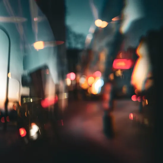Dieses fesselnde Foto zeigt eine dynamische urban Landschaft in der Dämmerung, in der verschwommene Lichter und Farben eine lebendige und fast träumerische Atmosphäre schaffen. Die Farben sind durch sanfte Töne von Blau und warmen Gelb- und Rottönen geprägt, die die Energie einer Stadt zum Leben erwecken. Die Unschärfe der Aufnahme vermittelt Bewegung und verleitet den Betrachter, sich in diese lebendige Szene hineinzuversetzen. Die Lichtreflexionen an den Straßen und Gebäuden sorgen für einen mystischen und nostalgischen Touch, was die Aufnahme sowohl modern als auch zeitlos erscheinen lässt.