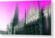Dieses fesselnde Kunstwerk zeigt eine impressionistische Darstellung einer majestätischen gotischen Architektur, die wahrscheinlich ein historisches Gebäude repräsentiert. Die markanten Türme und spitzen Dächer streben in den Himmel, während sie in einem hypnotisierenden Spiel von Farben und Licht nebulös und verschwommen wirken. Der Hintergrund ist in einem sanften, fast traumhaften Pink gehalten, das eine einzigartige, magische Atmosphäre schafft. Die Details der Fassaden sind nicht klar definiert, was dem Bild eine gewisse Mystik verleiht. Diese Kombination aus Form und Farbe erweckt den Eindruck einer urbanen Märchenlandschaft und schafft eine einladende und fesselnde Stimmung.