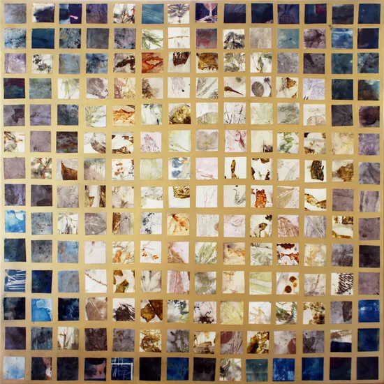 This intricate artwork features a grid of 100 small, vibrant squares, each showcasing a unique abstract image or texture ranging from muted pastels to deep, rich hues. The interplay of colors creates a harmonious visual rhythm, leading the eye across the canvas. Gold framing enhances the elegance of the piece while drawing attention to the individual sections, which contain organic patterns, soft brushstrokes, and layers that evoke feelings of depth and complexity. The overall composition exudes a sense of balance and unity, inviting viewers to explore each section closely. This painting can serve as a stunning focal point in modern and contemporary interiors. It would work beautifully in living rooms, dining areas, or gallery walls, providing an inspiring backdrop that can tie together various decor styles. Additionally, it can create a thought-provoking atmosphere in a home office or creative workspace.