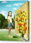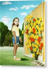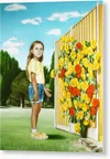 This captivating painting features a young girl standing in a vibrant outdoor setting. She is dressed in a bright yellow t-shirt and denim shorts, exuding a youthful and cheerful aura. Her thoughtful expression invites viewers to engage with her story. Behind her, a wall adorned with a stunning bouquet of yellow, orange, and red roses creates a bold contrast against the cool blue sky. The lush greenery in the background suggests a serene park-like environment, enhancing the overall atmosphere of innocence and curiosity. The meticulous detail in the girl’s features and clothing, combined with the vivid floral arrangement, showcases an impressive blend of realism and artistic interpretation. This painting can serve as a delightful focal point in various interior spaces. Ideal locations include a child's bedroom or playroom, where it can inspire imagination and joy. It would also add a playful touch to a cozy living room or a sunlit hallway, enhancing the ambiance with its cheerful colors and engaging subject matter.