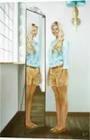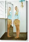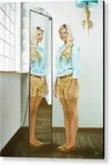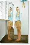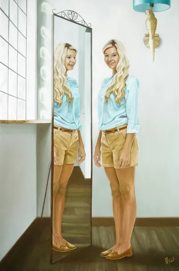 This captivating painting captures a stylish young woman standing beside a full-length mirror, reflecting her cheerful demeanor. She has long, flowing blonde hair and is dressed in a light blue blouse paired with beige shorts, embodying a fresh and contemporary look. The rich, warm tones of her skin complement the earthy shades of her outfit. The setting features a sleek, modern interior with hints of natural light filtering through a window, creating an inviting atmosphere. The detailed reflection in the mirror adds depth to the composition, drawing the viewer’s eye and enhancing the overall narrative of self-reflection and confidence. The use of soft brush strokes and subtle highlights brings a lifelike quality to the piece, making it a delightful focal point for any room. This painting would be an excellent addition to a modern living room, bedroom, or hallway, where it can inspire feelings of positivity and self-confidence. Its light and airy aesthetic would blend well with minimalistic or contemporary decor, while also adding a touch of elegance. Ideal for spaces that emphasize natural light and openness, this artwork invites viewers to appreciate both the beauty of the subject and the intricacies of everyday life.
