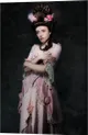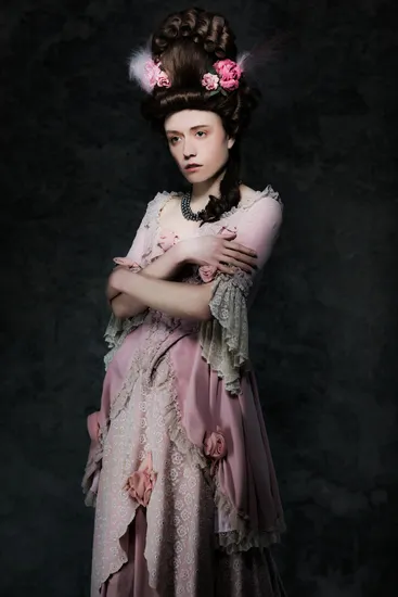 This striking portrait presents a young woman adorned in an exquisite 18th-century-inspired gown, characterized by its delicate pink fabric, intricate lace detailing, and ornamental floral accents. The gown drapes gracefully, with soft ruffles cascading elegantly along the sleeves and hem. Her hair is styled in a dramatic updo, embellished with pastel pink roses and airy feathers, enhancing the romantic aesthetic. The muted background lends depth, creating a stark contrast that draws the eye to her poised expression and gentle demeanor. The interplay of light emphasizes her fair complexion, capturing an ethereal and almost nostalgic quality, reflective of a bygone era. This enchanting artwork would be a captivating focal point in various interior settings. It is particularly suited for places such as a boutique, an elegant dining room, a classy salon, or any vintage-inspired decor. Its romantic essence can elevate a personal study or reading nook, creating a serene atmosphere.