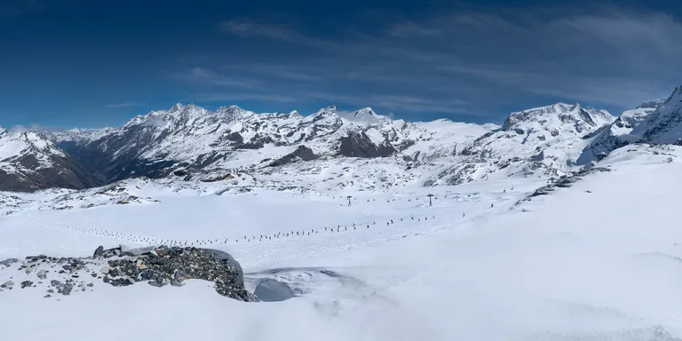 This breathtaking panoramic view captures a stunning winter landscape, showcasing a vast expanse of snow-covered mountains under a crystal-clear blue sky. The foreground features a rugged rocky outcrop dusted with snow, leading the eye towards the sweeping slopes of the distant peaks, which tower majestically. The clean white snow glistens in the sunlight, creating a serene and tranquil atmosphere that invites contemplation. This slice of nature’s wonder is both invigorating and calming, making it an ideal centerpiece for any interior seeking to bring a touch of the outdoor beauty within. This painting would be perfect for use in modern and rustic interior designs. It can enhance living rooms, offices, or even mountain lodges, creating an uplifting ambiance that evokes a sense of adventure and tranquility. Hanging this artwork in a space with natural wood elements or minimalist decor will allow the beauty of the landscape to shine, making it a conversation starter and an inspiring visual escape.
