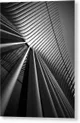 This striking black and white photograph captures the intricate architectural lines of a modern building, emphasizing its dynamic structure and unique design. The image is taken from a low-angle perspective, showcasing elongated, curved elements that create a sense of movement and rhythm. The interplay of light and shadow accentuates the sleek surfaces, while reflections on the glass add depth and complexity to the composition. This captivating perspective draws the viewer's eye upward, evoking feelings of awe and admiration for contemporary architecture. This artwork would enhance interior spaces such as modern offices, contemporary living rooms, or upscale lobbies. It complements minimalist decor and can also serve as a statement piece in art galleries or design studios, adding a touch of sophistication to the environment.