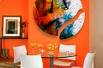 This stunning round painting showcases a dynamic blend of colors, incorporating vibrant oranges, deep blues, and lively yellows. The abstract design features swirling patterns and fluid shapes that create a sense of movement and energy, inviting the viewer's eye to explore each detail. The combination of textures, with glossy finishes juxtaposed against more matte areas, generates visual interest and depth. The artwork is set against a striking orange wall, enhancing its bold colors and making it a focal point in the dining area. This painting would be ideal for modern dining spaces, contemporary living rooms, or stylish entryways. Its vibrant palette allows it to complement a variety of interior styles, from minimalist to eclectic. Consider placing it above a dining table or a console table to create a visually appealing contrast against neutral furniture. The artwork can also be an excellent conversation starter in social gatherings.