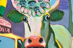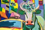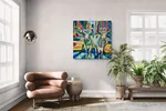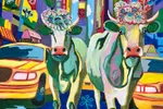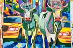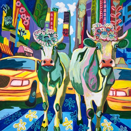 This vibrant painting features two charming cows adorned with floral decorations, standing confidently amidst a bustling cityscape. The background is filled with tall skyscrapers, colorful storefronts, and iconic yellow taxis, all rendered in bold, exaggerated colors. The bright hues of blue, green, and yellow dominate the composition, creating an energetic and whimsical atmosphere. The flowers on the cows' heads add a playful touch, while the stylized street elements emphasize a lively urban setting. The overall aesthetic combines elements of pop art and modern expressionism, emphasizing the contrast between rural charm and urban life. This painting would be an eye-catching addition to various interior spaces, particularly in a living room, restaurant, or café that embraces a quirky and artistic vibe. Its bright colors and playful subject matter make it perfect for creative environments, serving as a conversation starter and enhancing the overall ambiance.